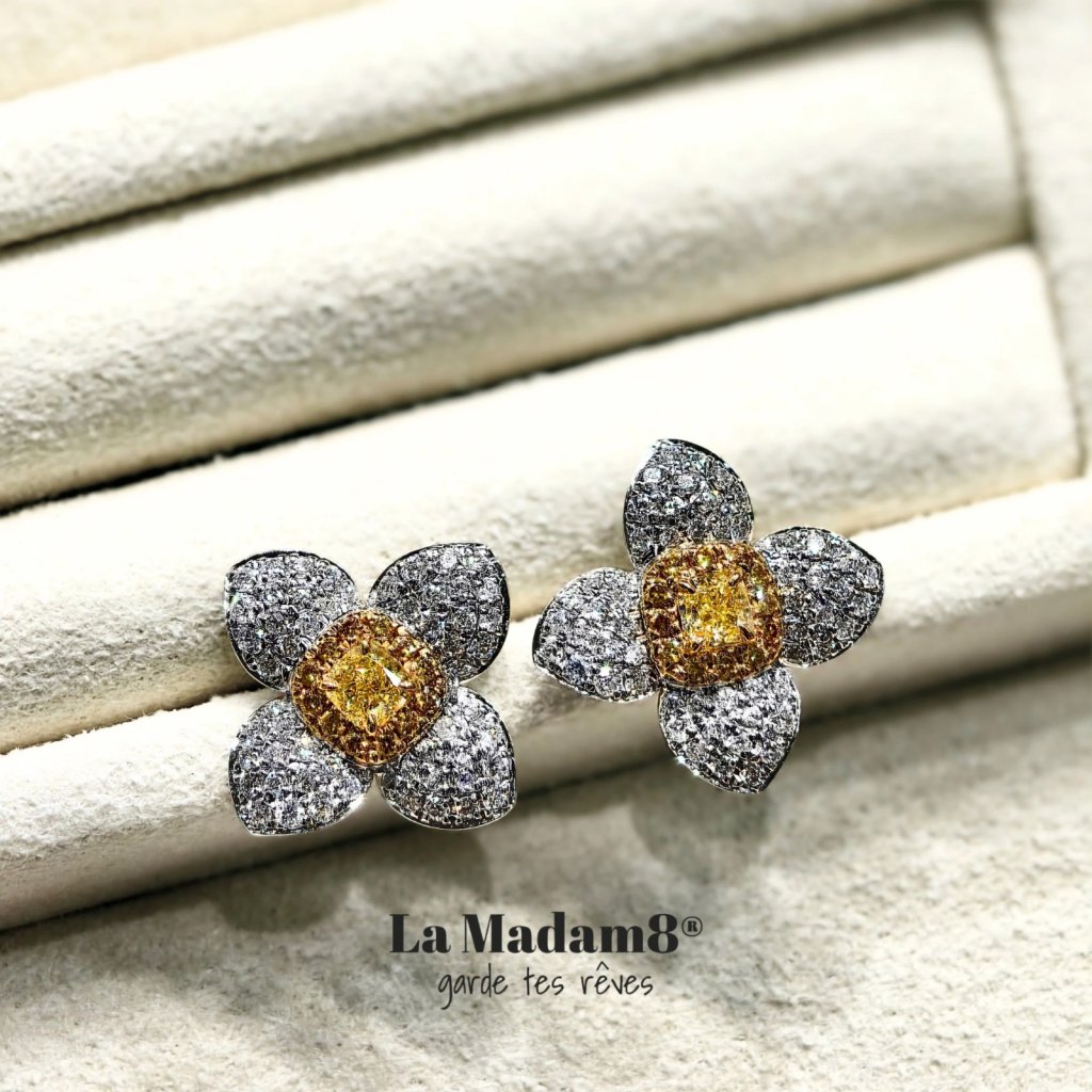 18K四葉花黃鑽天然鑽石耳釘(貨期30/4)